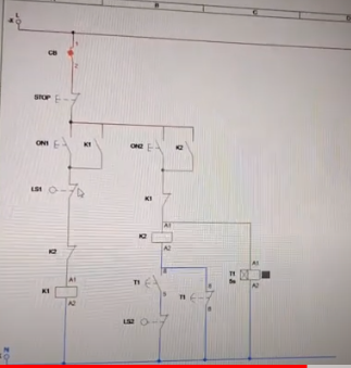 - NHẤN DOWN : CỬA ĐI XUỐNG , K1 ĐÓNG VAI TRÒ KHÓA CHÉO, T1 (TIMER ) CẤP ĐIỆN CHO K2 SAU 5S. CỬA ĐI XUỐNG GẶP LS2 (CẢM BIẾN HOẶC CTHT ) SẼ DỪNG LẠI.