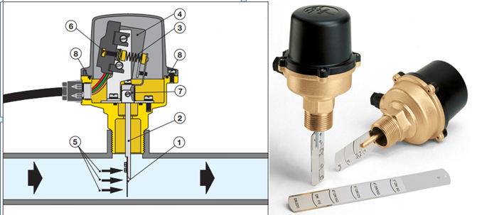 Công tắc dòng chảy được trang bị một bộ lưỡi cắt (1), được sử dụng cho các đường kính ống có kích cỡ khác nhau, đặc biệt có kích thước phù hợp cho phép lắp đặt dễ dàng và giảm thiểu mất mát áp suất.