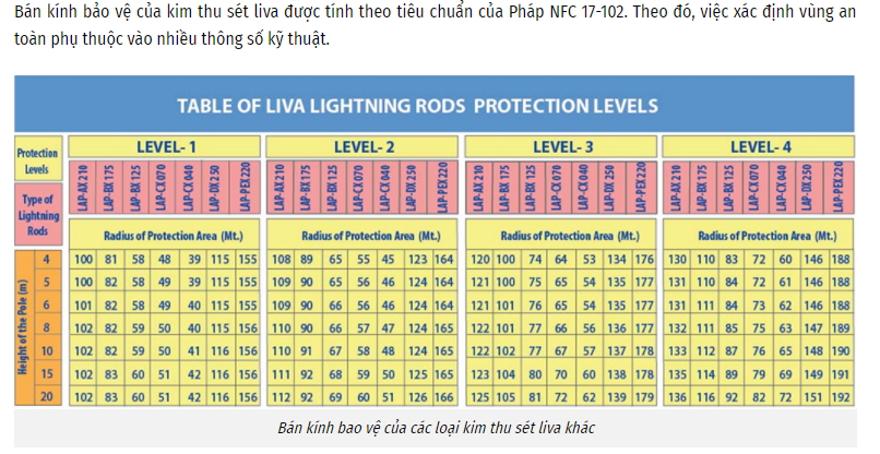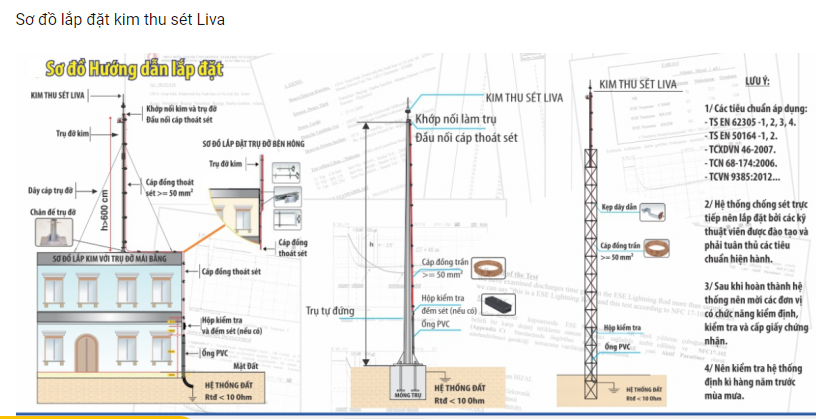 - Tiêu chuẩn áp dụng theo tiêu chuẩn NFC 17-102 năm 2011. Kim thu sét Liva được chế tạo từ vật liệu Inox 304, với vật liệu Inox không gỉ nên kim chống sét Liva có độ bền và tuổi thọ rất cao.