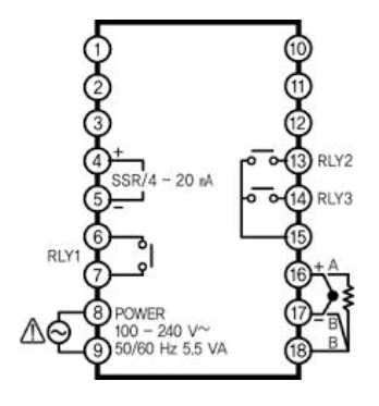 Các chân ngõ ra điều khiển của đồng hồ nhiệt. ngõ ra chính 4-20mA(chân 7+và chân 8-). Ngõ ra Alam: Alam1(chân 19 và 21), Alam2(chân 20 và 21). Sau khi kiểm tra cơ cấu chấp hành và sơ đồ đấu nối dây đã chính xác ta tiến hành cái đặt các bước như sau.
