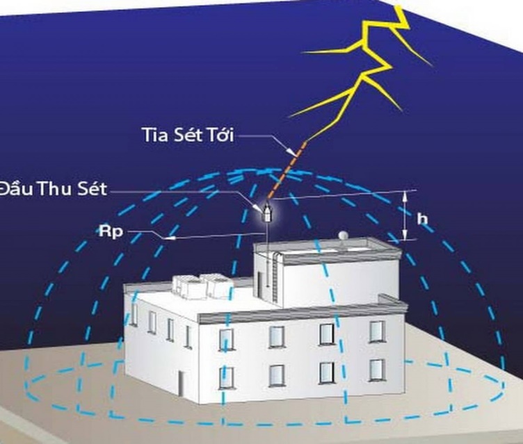 (Phụ lục B tiêu chuẩn Pháp NF C17-102 và chiều cao trụ đỡ kim thu sét bao trùm diện tích được bảo vệ, chiều cao h tối thiểu >= 2m)
