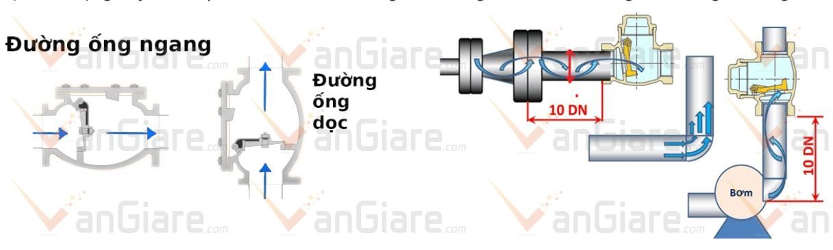 Một số thiết bị: y lọc, góc chuyển, bơm..có thể gây ra tình trạng bất ổn của dòng chảy như làm áp lực thay đổi tác động lên lá (đĩa) của van. Gây hiện tượng van đóng/mở liên tục, nước sẽ rò rỉ ngược lại. Khắc phục tình trạng này, nên lắp van cách xa 1 khoảng cách bằng 10 lần DN (Đường kính trong của ống)