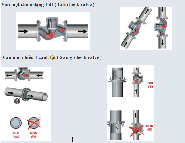 – Phân loại : van một chiều đa dạng về chủng loại, mỗi loại có đặc tính và ứng dụng khác nhau như: van một chiều loại một cánh lật (Swing),van một chiều hai cánh lật (Wafer), van một chiều dạng trục (Axial), van một chiều dạng bi (Ball), dạng đối trọng (Tilting)…..