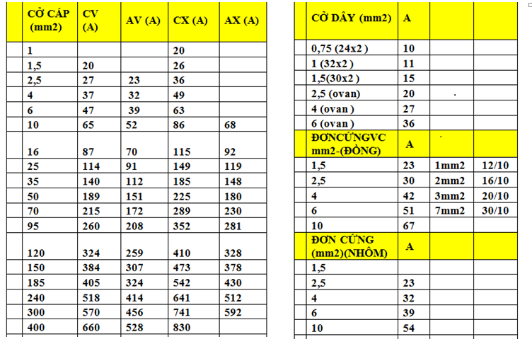 THÔNG SỐ DÒNG ĐIỆN DÂY ĐIỆN CADIVI