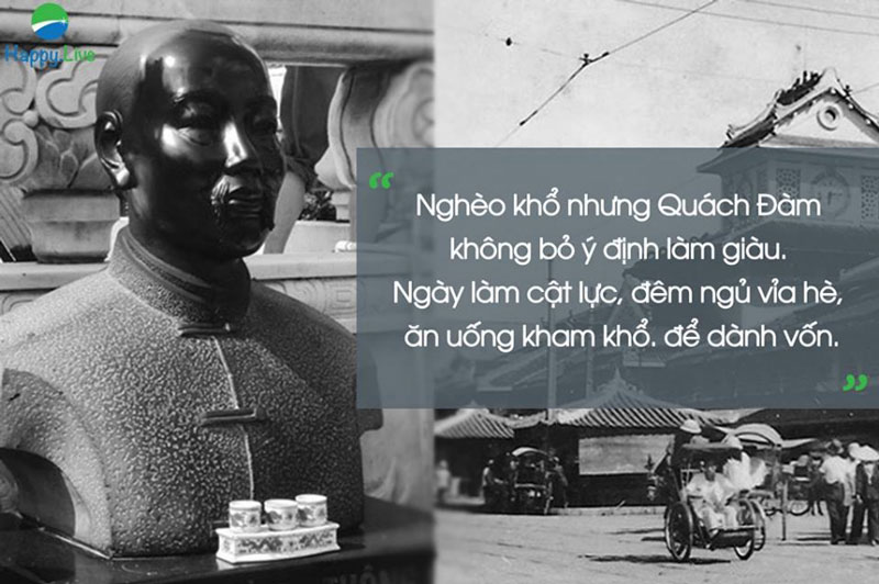 Ông Phạm Văn Thiều, người chuyên nghiên cứu lịch sử Sài Gòn xưa cho biết: "Quách Đàm (1863 -1927), vốn là một thương gia gốc Hoa, ở làng Triều An, Long Khanh, Triều Châu, Trung Quốc. Khởi thủy, chú Quách cũng toòng teng đôi quang gánh đi khắp hang cùng ngõ hẻm khu vực Chợ Lớn để mua bán ve chai. Chú không nhà không cửa, người thân thích, cứ đi mua bán cả ngày, tối về lại kiếm mái hiên trong khu phố Chợ Lớn cũ (khu vực bưu điện Chợ Lớn, đầu đường Châu Văn Liêm hiện nay) để ngủ.