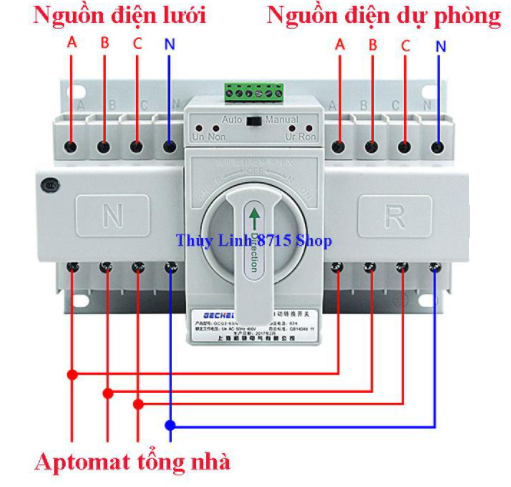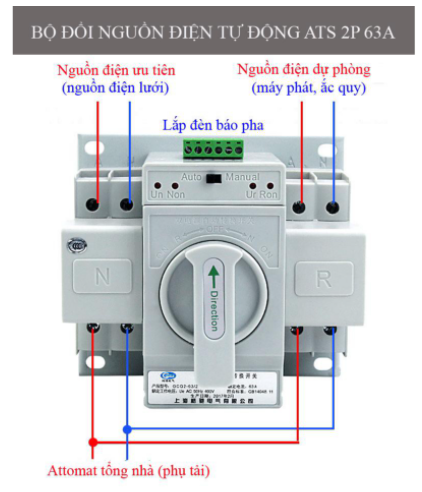 Dòng điện cho phép tối đa: 63A. - Có thể sử dụng ATS-2P-63A tự động hoặc thủ công: + Nhấn nút điền khiển trên đầu thiết bị về Automatic (tự động), công tắc sẽ chuyển về Normal power (điện lưới) hoặc Reverse power(điện dự phòng) một cách tự động + Nhấn nút về Manual (thông thường), người sử dụng sẽ phải tự chuyển Direction(nguồn điện) bằng tay. - Khi cả hai bên nguồn điện ưu tiên và nguồn điện dự phòng đều có điện thiết bị sẽ chuyển chuyển mạch về phía nguồn ưu tiên cấp điện cho phụ tải bằng nguồn ưu tiên. - Chú ý: Nguồn sẽ bị gián đoạn khi chuyển mạch –