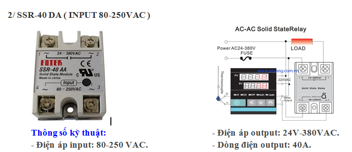 Loại relay bán dẫn tín hiệu điều khiển 90~20 vdc cho phép nhập tín hiệu từ bộ điều khiển (Bộ PID) có ngõ ra là relay , lấy nguồn điều khiền từ lưới điện 220 vac.
