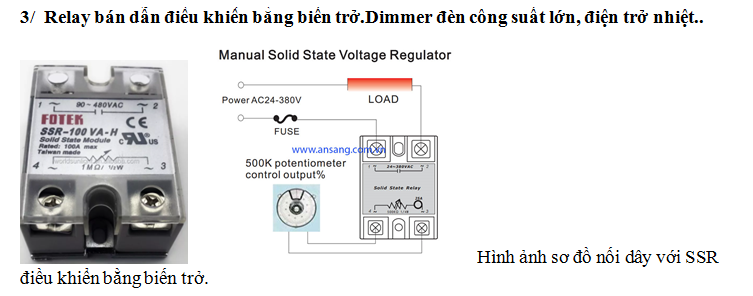 3/ Relay bán dẫn điều khiển bằng biến trở.Dimmer đèn công suất lớn, điện trở nhiệt..
