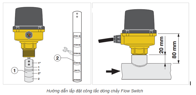 Công tắc dòng chảy nên được lắp trên ống với thanh điều khiển thẳng đứng, theo hướng dòng chảy được chỉ ra bởi mũi tên trên nắp và trên thân ngoài của sẩn phẩm.