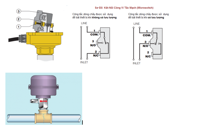Việc cài đặt được thực hiện bằng cách xoay vít (1) theo chiều kim đồng hồ để đóng công tắc ở tốc độ dòng chảy cao hơn hoặc ngược lại với các giá trị thấp hơn. Sau khi thực hiện điều chỉnh, khóa vít cài đặt bằng vòng đai (2). Người sử dụng được bảo vệ để tránh tiếp xúc ngẫu nhiên với điện vì các bộ phận của công tắc dòng chảy bằng có một lớp bảo vệ cách điện (3) trên Microswitch.