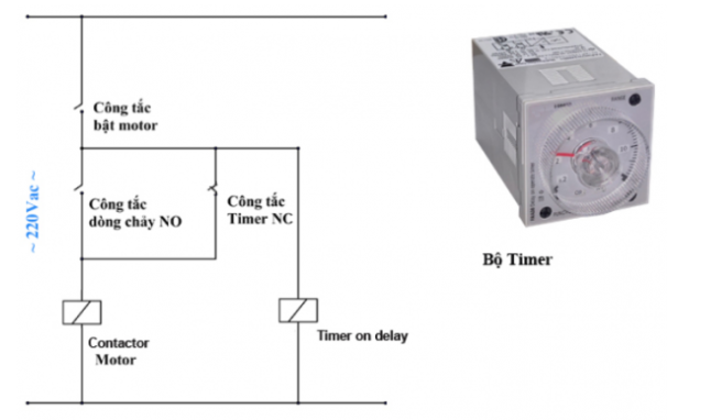 Khi công tắc bật motor kích hoạt, bộ hẹn giờ cũng được kích hoạt, điện qua công tắc Timer NC làm motor khởi động và bơm nước, khi có nước chảy trong đường ống thì công tắc dòng chảy kích hoạt duy trì trạng thái. Công tắc Timer NC sẽ ngắt ra trong một khoảng thời gian cài đặt, nếu nước trong đường ống không chảy thì motor cũng ngừng chạy theo tiếp điểm Timer NC. Đối với các ứng dụng có dòng nước chảy yếu, lưu lượng thấp, không có khả năng tác động được lá cảm biến thì không thể xài công tắc trên thì chúng ta phải sử dụng qua cảm biến báo nước chảy.