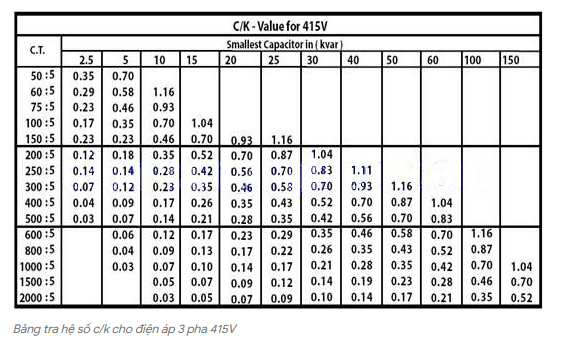 Giả sử rằng ta dùng bộ điều khiển 6 cấp để điều khiển bù 4 cấp tụ, mỗi cấp tụ là 20KVar, 415V, biến dòng sử dụng là loại 250/5A => Hệ số C/K là 0.56.
